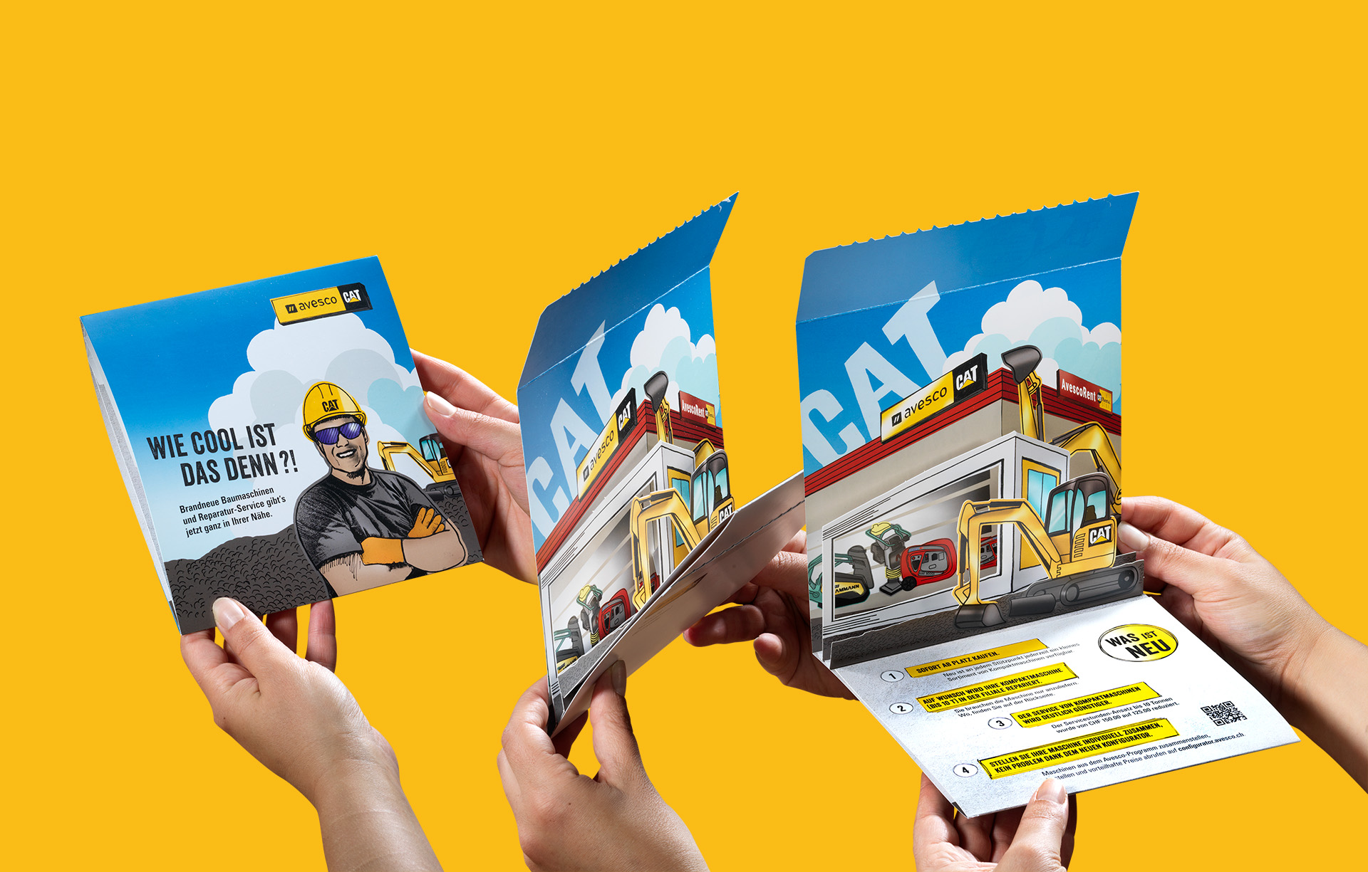 Für Avesco und Caterpillar realisierten wir vielseitige Kampagnen, die die Kraft der Maschinen und den Charakter der Marken konsequent inszenieren. Die eindrucksvolle Arbeitswelt der Bagger bildet dabei den visuellen Kern und verleiht der Kommunikation Ausdruck, Authentizität und einen hohen Wiedererkennungsgrad. Ergänzend dazu entwickelten wir aufmerksamkeitsstarke Mailings und aussergewöhnliche Broschüren, die überraschen, Emotionen wecken und zusätzliche Berührungspunkte schaffen. So wird die Markenbotschaft nicht nur sichtbar, sondern erlebbar. Ein weiteres prägendes Element sind Kampagnen mit prominenten Persönlichkeiten wie Gölä, Trauffer oder dem Schwingerkönig Matthias Sempach. Sie stehen für Bodenständigkeit, Stärke und Glaubwürdigkeit – Werte, die sich nahtlos mit den Marken Avesco und Caterpillar verbinden und die emotionale Bindung zur Zielgruppe nachhaltig stärken.