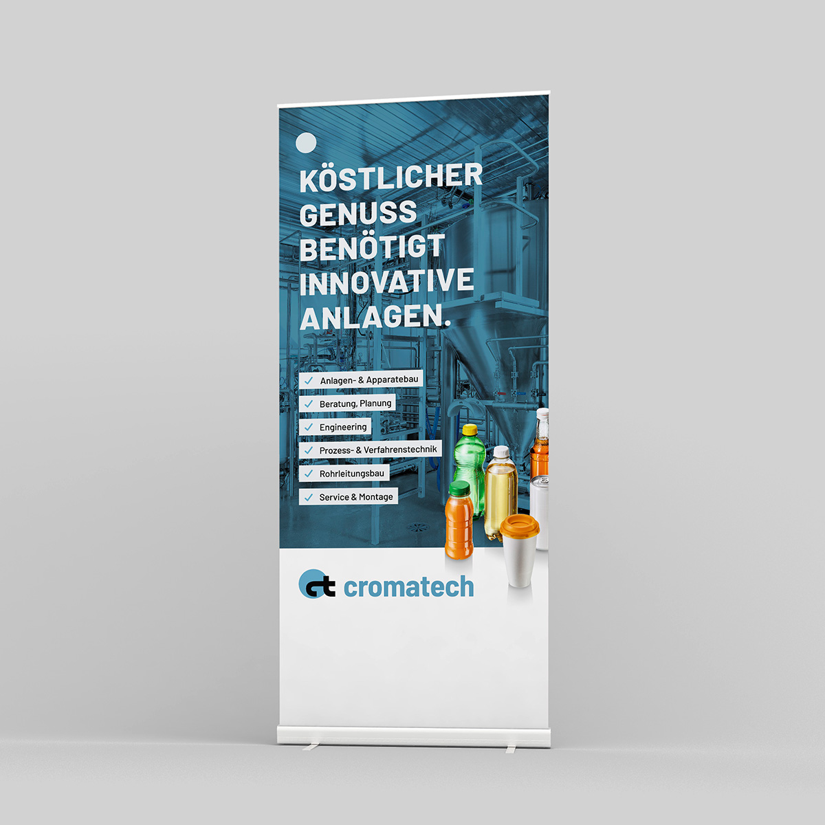 Für die Cromatech AG entstand ein Markenauftritt, der die Komplexität moderner Fertigungsanlagen sichtbar macht. Als Spezialist für Lösungen in der Food-, Getränke- und Kosmetikindustrie entwickelt Cromatech hochpräzise Systeme. Diese technische Tiefe sollte auch visuell erlebbar werden.