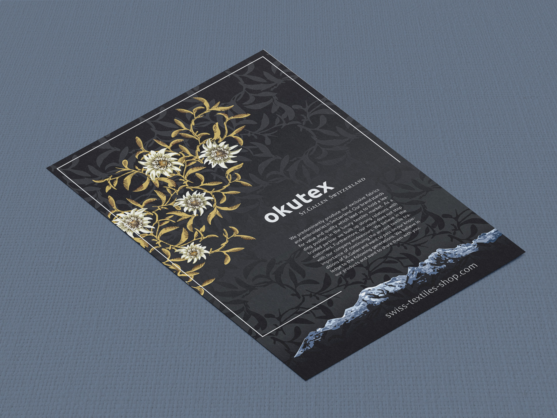 Okutex ist eine traditionsreiche St. Galler Textilfirma, zuhause im exklusivsten Kundensegment. Spezialisiert auf aussergewöhnliche Stoffe, die weltweit weiterverarbeitet werden, steht Okutex für höchste textile Qualität und Präzision.